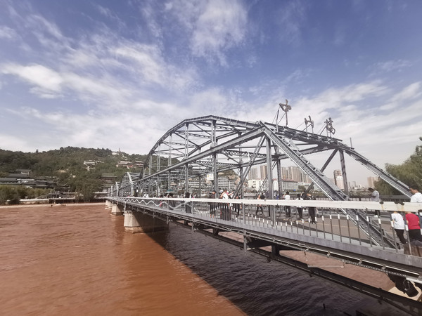 参观完打车去黄河铁桥(又称中山桥),铁桥长两百多米,宽约有七八米,保持了一百多年前修建时的黑色铁架桥身,铁桥当年由德国人建设施工,所有的材料也都由德国运来