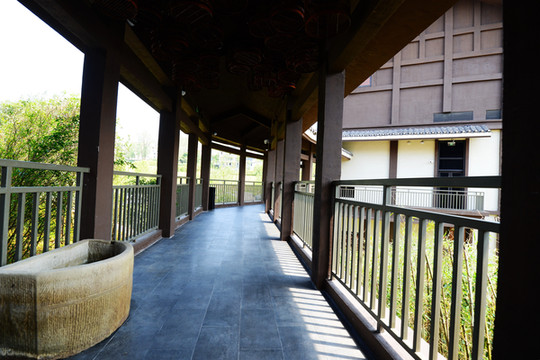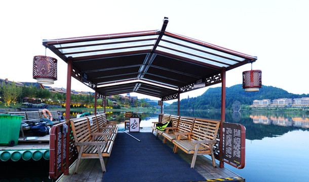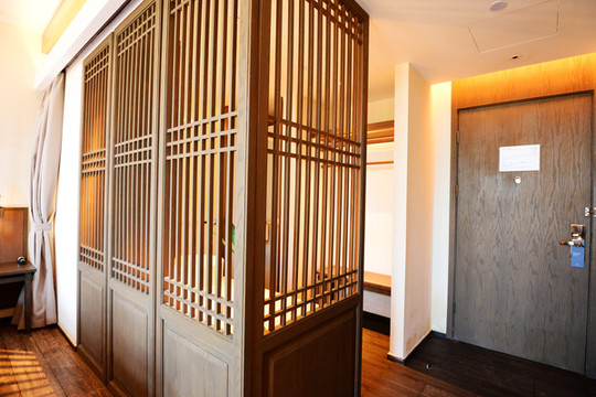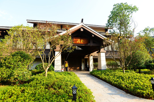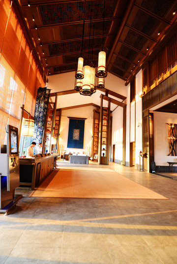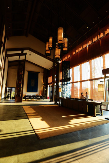 过了酒店牌楼,穿过一个小园林才能到达前台,整个酒店错落有致的建在湖边,与湖光山色无缝对接~