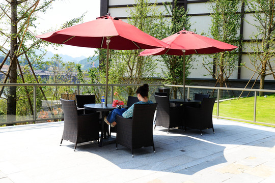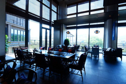大堂摆放的沙发座椅全都是中式全手工的实木沙发,为了防止硌人,酒店还细心地放着有苗族图案的蜡染靠枕,柔软舒适,在这里既可以等候、休憩,眺望窗外的园林美景,也可以享受精美的咖啡、茶饮、下午茶、甜点等,是休憩商谈的理想场所。