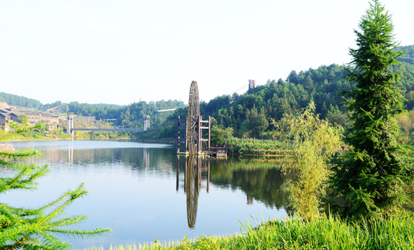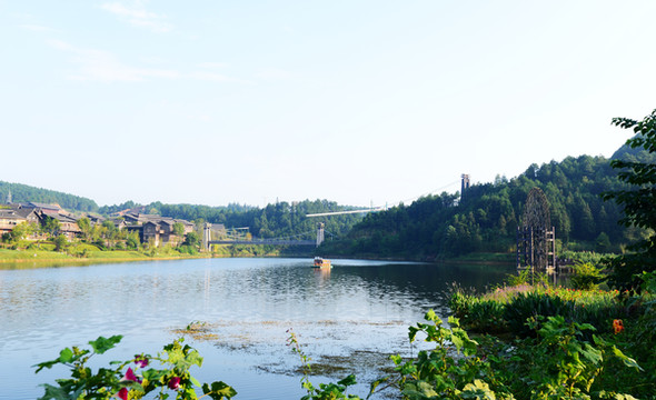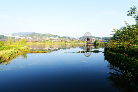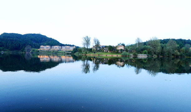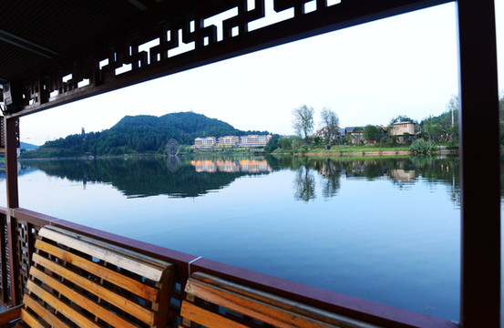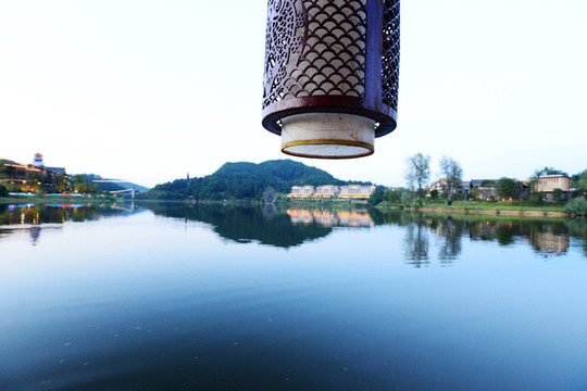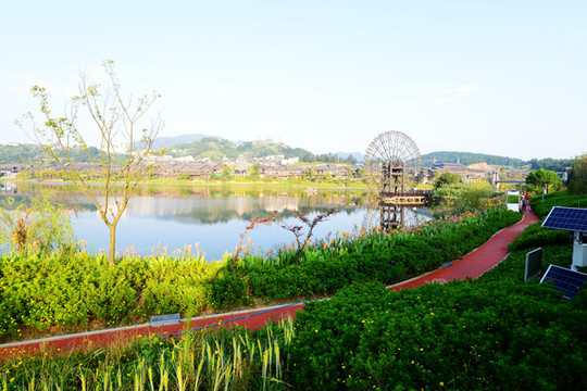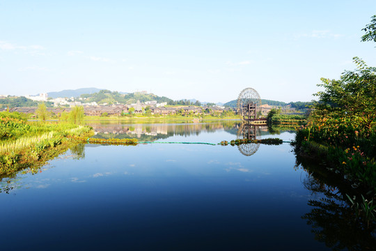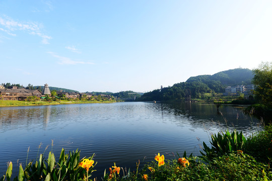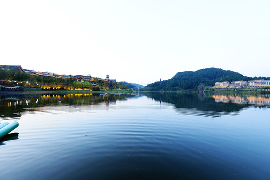 宽阔的湖面像一面澄碧如镜的大镜子,映着远处翠绿的山,碧蓝的水,完全是江南水乡的样子。若驾一叶扁舟泛舟湖上,望青山卷白云,有一种隐居世外的悠然。