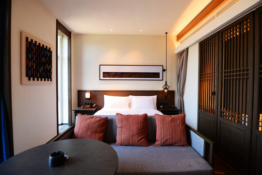 回到重点,酒店体量很大,有300多间客房,分南区、北区,想走遍酒店会腿软,另外还有两栋特色庭院,所有房间都是朝湖的景观房,躺在床上就能将湖景夜色一览无余,惬意舒心。