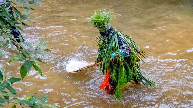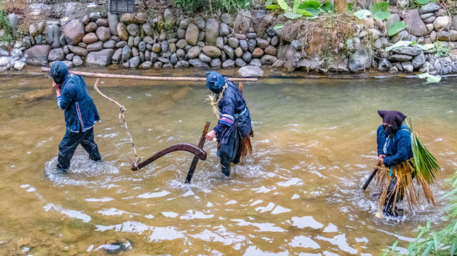 在今天零下好几度的气温下他们直接跳到小河中抓鱼表演。