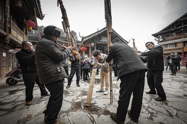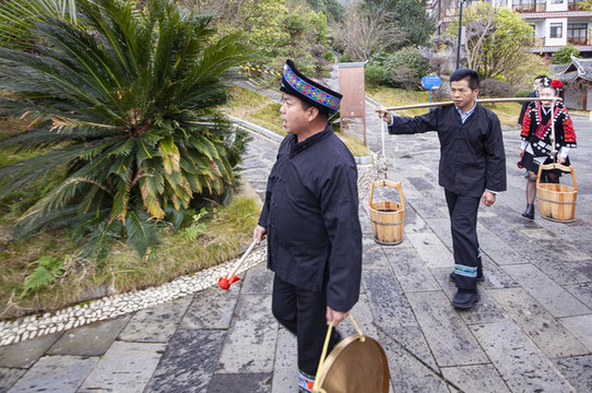 1986年在法国巴黎金秋艺术节上,以黎平县为代表的侗族大歌一经亮相技惊四座,获得“清泉般闪光的音乐,掠过古梦边缘的旋律”的盛赞。在2009年,侗族大歌被列入世界人类非物质文化遗产代表作名录。侗寨非遗活动:抬官人