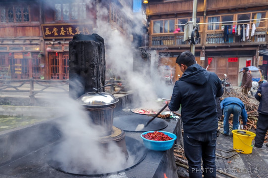 第二天杀牛时,会将牛的草料胃液取出用火熬煮,滤掉渣滓后,剩下汁水,这就是牛瘪火锅的底料啦。