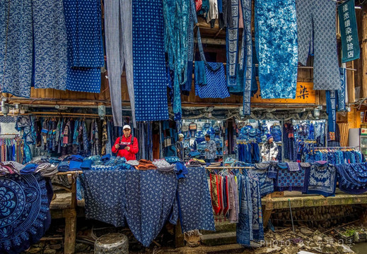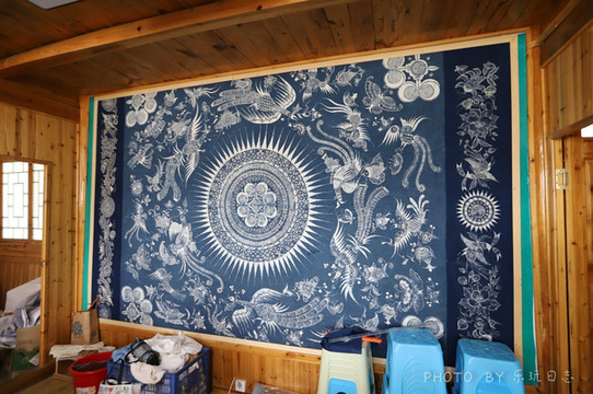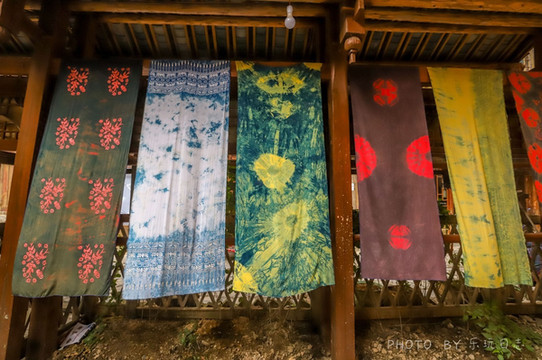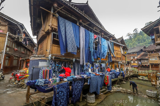 在侗寨随处可见当地人晾晒在外的侗布,靛染在这似乎是很家常的一件事情。这种蓝靛染技艺是通过以草本植物(蓝靛草)为原料,加入烧酒、土碱、石灰和牛皮胶做辅料,用水泡出蓝汁制作 成蓝靛,再用之来染布,再用牛皮熬成的牛皮胶上在色布上,用石滚滚平,直到光亮,为成品的蓝靛布料。