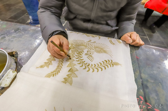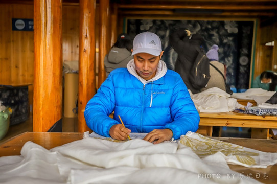 侗染的流程是,先绘图案,然后再给图案上蜡。之后送到染缸泡浸,晒干,期间还要以加入扎染等工艺。