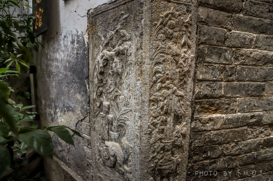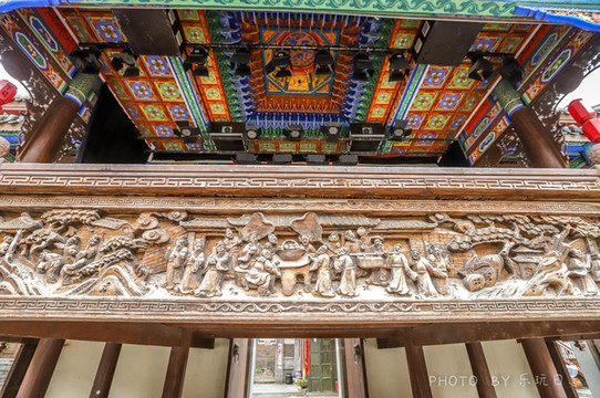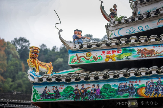 在檐角上,还有狮子、一些侗族人生活的场景石雕像。