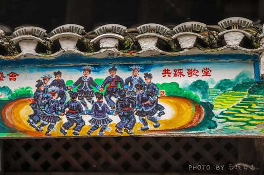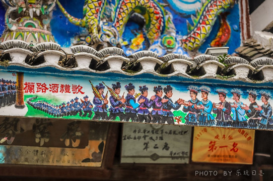 檐沿下,画满了侗族的风俗,像拦路酒礼酒、共踩歌堂、侗族大歌等等,很有民族特色。