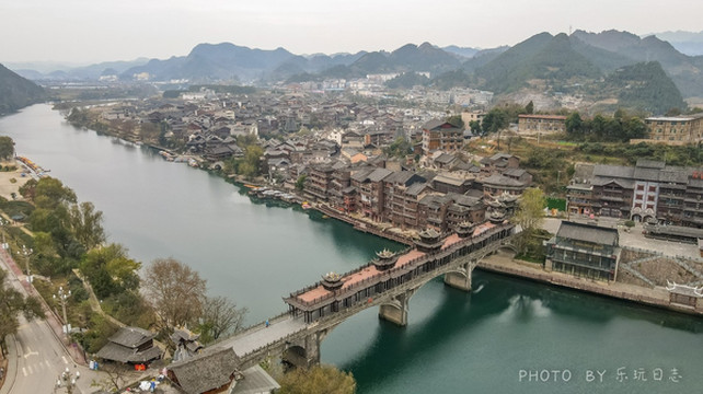 侗寨五团中,每团都有一座风雨桥。风雨桥和鼓楼倒影在河面上,美极了,桥上端还有两条游龙雕像。