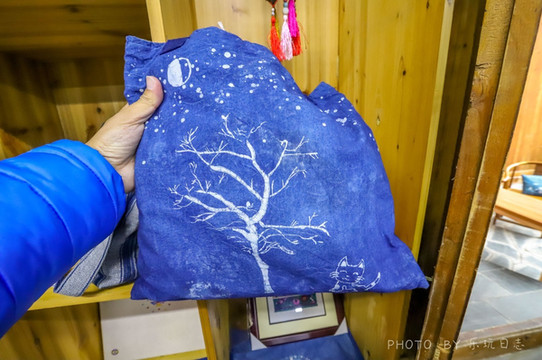 我手上这个,就是用扎染和靛染制作出来的成品,漂亮不?