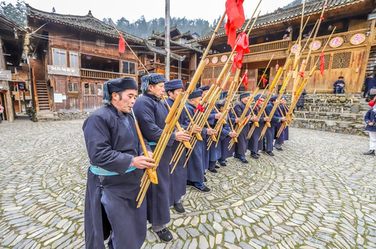 侗年节日期间,会有芦笙比赛,比赛由侗寨里五大宗族的男人组队参加,他们都头戴布巾,手持芦笙,伴随着芦笙的乐曲翩翩起舞。