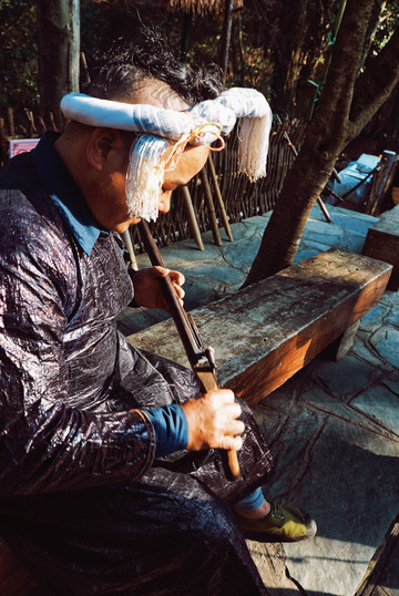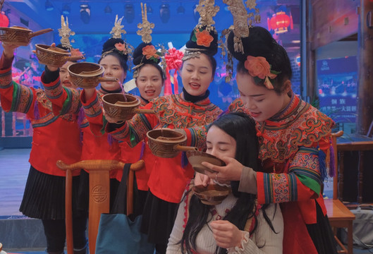 到达西江的时候,在寨子门口正赶上一场为远道而来游客进行的欢迎演出,还有非常有苗族仪式感的十二道拦门酒。老人们唱起飞歌,吹响芦笙,苗族姑娘们穿着满绣的百褶裙,朴拙而华美。发髻乌黑油亮,手工打造的银质头饰一片璀璨,身动铃响,轻灵耀眼。