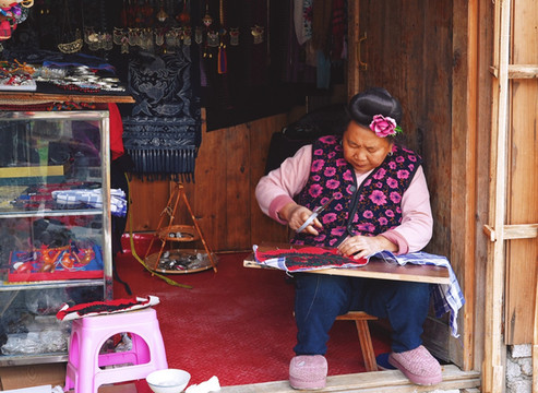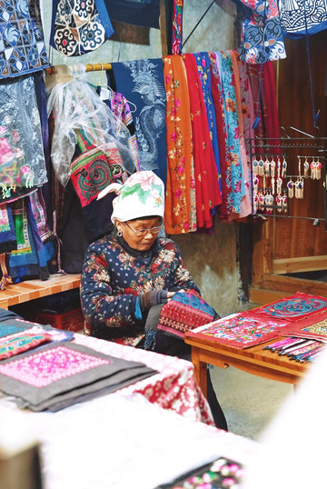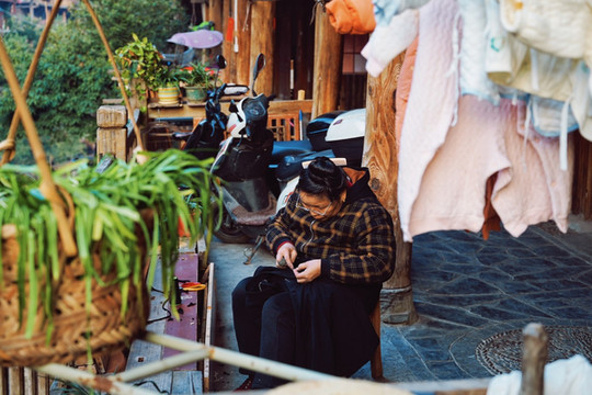 寨子十分原生态没有商业化,老人们在寨子的巷子里,一天的日常或烹茶煮饭,或刺绣带娃,或打开店门,迎进三三两两的游客。粗布蜡染,古老的袖片,手制银饰,都仿佛带我们走进古早年代的记忆。