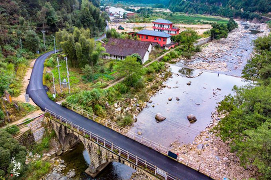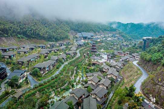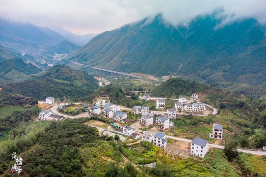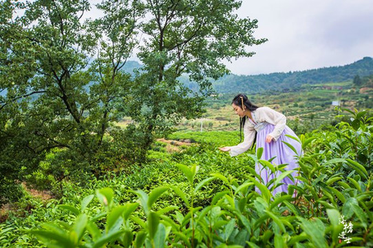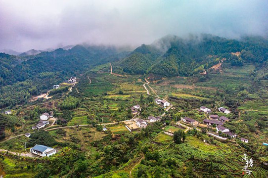 从高空俯瞰,茶园齐整,房舍俨然,山峦叠翠,草木葱绿。白色的民居覆盖着灰瓦,显出水墨画的雅致和诗意,远处的薄雾笼罩群山,宛若缥缈仙境。