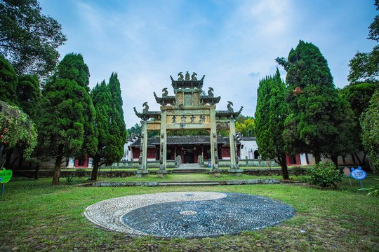 鹅湖书院位于江西上饶铅山县鹅湖山麓,是我国古代江西四大书院之一。走进书院不远便看到一座相当古朴的石牌坊,四柱,上书“斯文宗主”四个大字是后人对理学之宗朱熹最到位的评价。飞檐上的雕刻造型尤其引人瞩目,远看仿佛一只只凤凰仰头看天,栩栩如生。