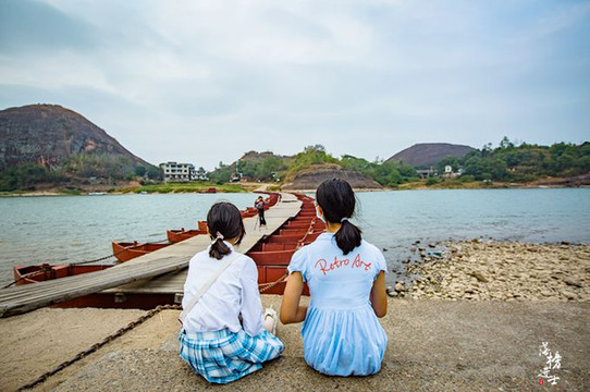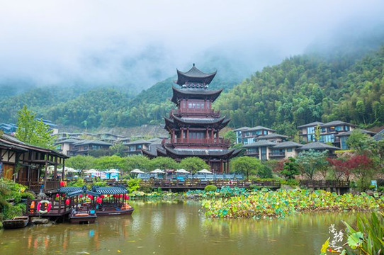 从山上下来,便从清净世界一脚踏进了花花尘世。暗红色的木质楼阁依靠在山脚下,依偎在碧水旁,整个景区从山上蔓延至山脚,让来往的游客从高到低,从早到晚过足了瘾。