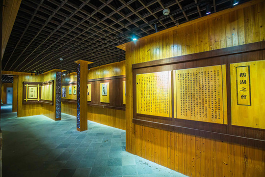讲堂是书院传道授业解惑之所,红黑白色调为主,整体庄重简洁。最前方设有讲台,两侧壁书有“忠、孝、廉、节”四个大字,为仿朱熹字体。站在讲堂里,凝神屏气,仿佛能看到学子来往穿梭、长歌对答的身影,能听到朗朗读书声。