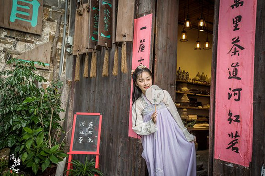 穿上古装,在这充满了古色古香的街道中,复古的背景瞬间便勾勒出古典韵味。