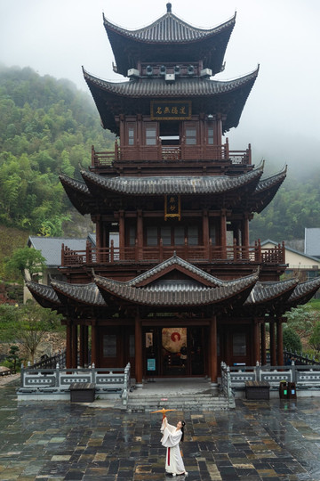众妙阁是景区的制高点,主楼高26米,采用古代建筑结构,为三层四柱的纯木结构。晚上的灯光表演先从“亮阁”开始。