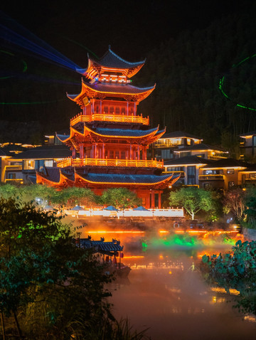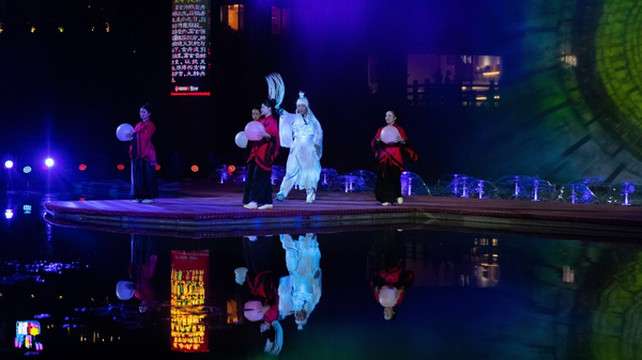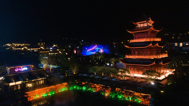 当流光溢彩的灯光投影在众妙阁上,似披上了七彩神衣。它周围也一并被五彩的灯点亮,多彩灯光随着古典音乐不断地变动,呈现出春、夏、秋、冬等不同的精美画面。