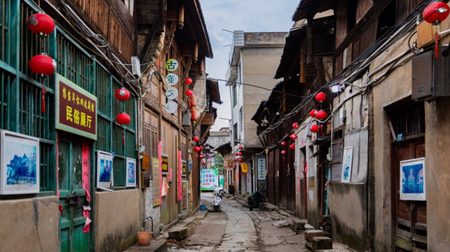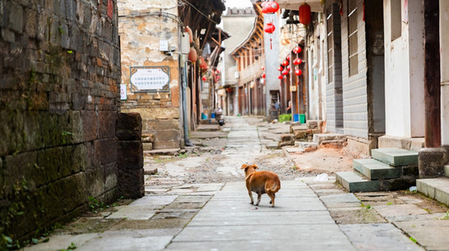 沿河五百米长的明清古街,层楼绵延,鳞次栉比,古老而典雅,青石板路面上的道道车辙,记录下当年小镇的繁荣。街巷游客不多,狗狗安心地在路边熟睡,一副岁月静好的模样。