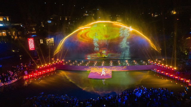 另外,这里还有《归真纪》水幕电影演出,一定不要错过。在水舞台上,舞蹈演员们伴随时而激荡、时而舒缓的音乐,演绎出一幕幕跌宕起伏的仙境传奇故事。