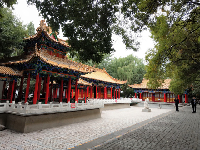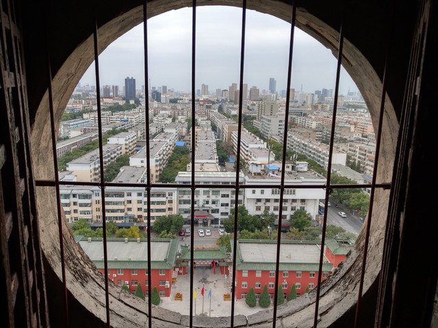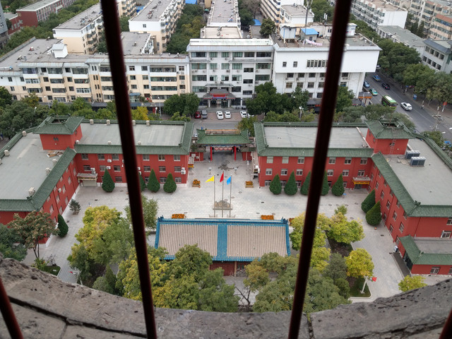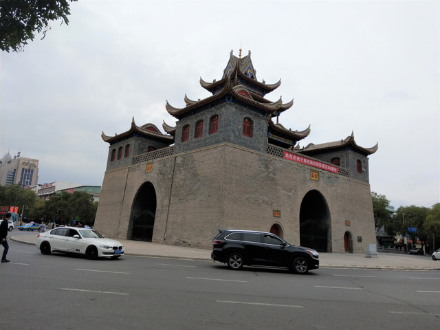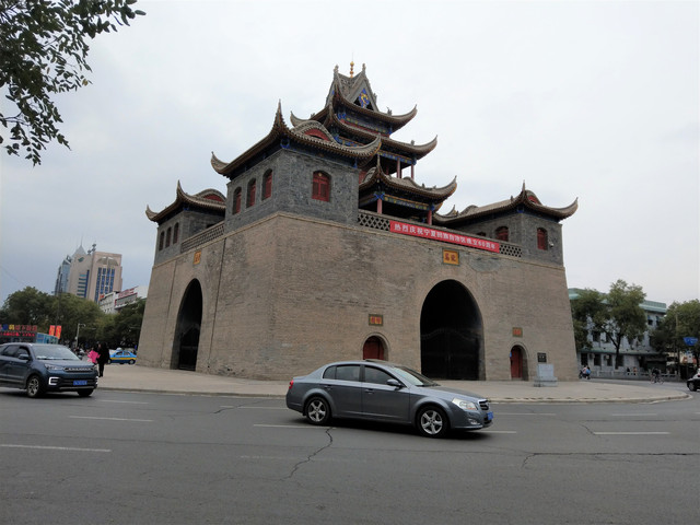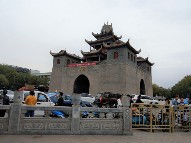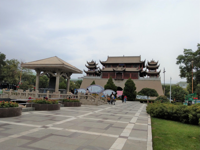 享受完美的誤餐時刻,便前往興慶區的中心地帶,鐘鼓樓,又簡稱鼓樓。鐘鼓樓的台基上方有角坊,中間是三層內縮較小面積的樓閣,外觀上與我以往所到之處的鐘鼓樓有些不同;鐘鼓樓的南方有一條熱鬧的步行街,東南方,有一片腹地滿大的寧園,是仿清代建築的都市園林;寧園再往下走,銜接的是玉皇閣;玉皇閣在明朝也是鐘鼓樓,到了清朝因地震損壞,後修建改為供奉道教玉皇大帝的玉皇閣。