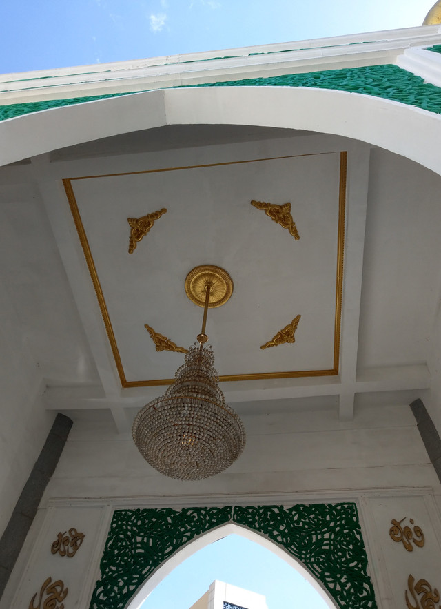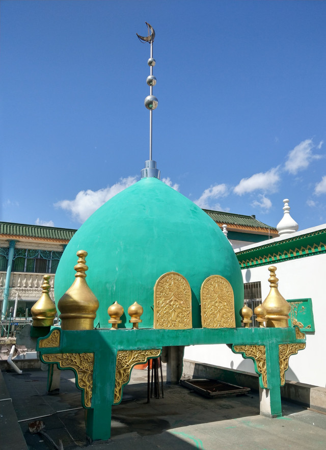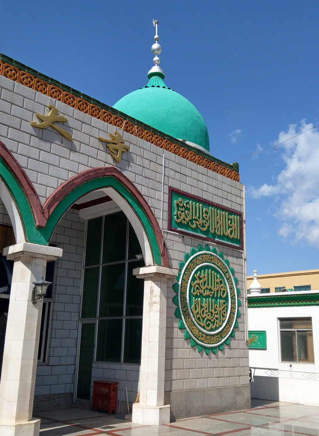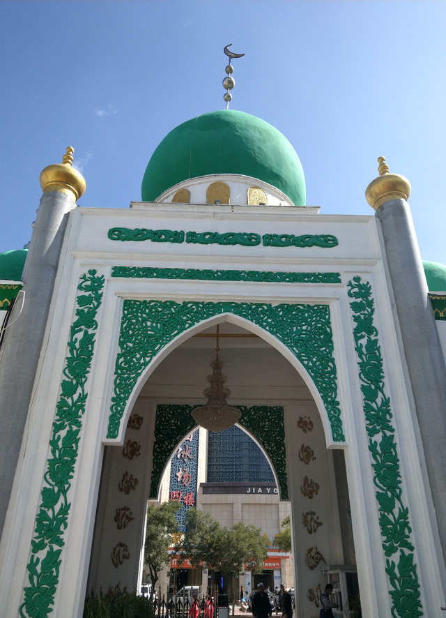 清真寺主要色調為白色、綠色和金色,白色的主建築牆,綠色的穹頂,再搭配金色鈎邊裝飾,更顯富麗。