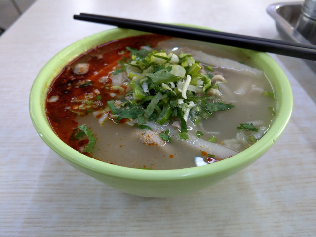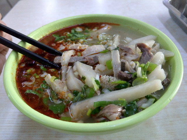 店裡的菜單簡單,分別是含麵的羊雜、全肉羊雜,以及羊雜肉夾饃三種。麵體呈現條塊狀,有點類似刀削麵,但口感卻又近似麵疙瘩又不相似,咬勁倒是還滿合我胃口;那碗裡滿滿的羊肉、羊肚、羊肝、羊腱等等,味道鮮美,白色的湯頭淋上紅通通的辣油,味道非常濃郁而不辛辣,也沒有羊肉的腥臊味,口齒留香,回味無窮,讓人有股想買冷凍包回去的衝動呢。