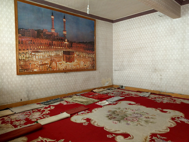 參觀完之後,我撇見一樓左側牆上,有塊指標大大寫著「女寺」,我好奇地走向左後方,那裡有間小小的房間,有些舊和髒,地上鋪著紅底白紋的地毯,還有幾塊排列整齊的墊子,牆上掛著一幅伊斯蘭教聖地麥加清真寺的裱框照片。