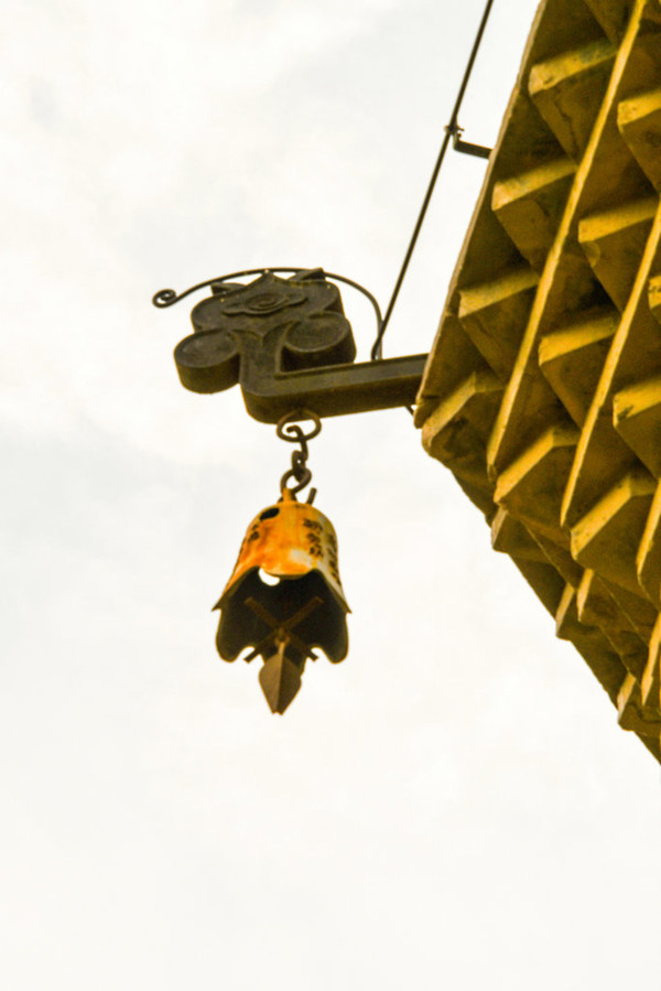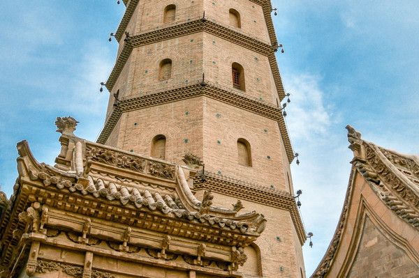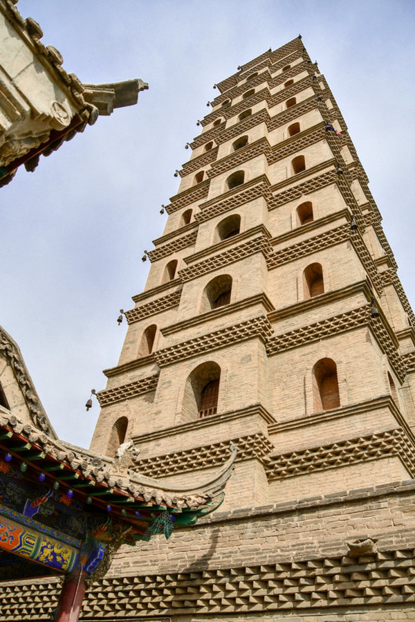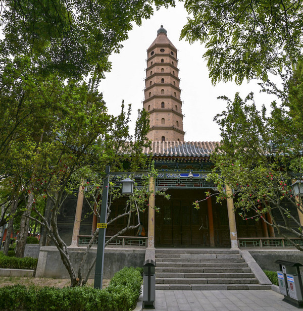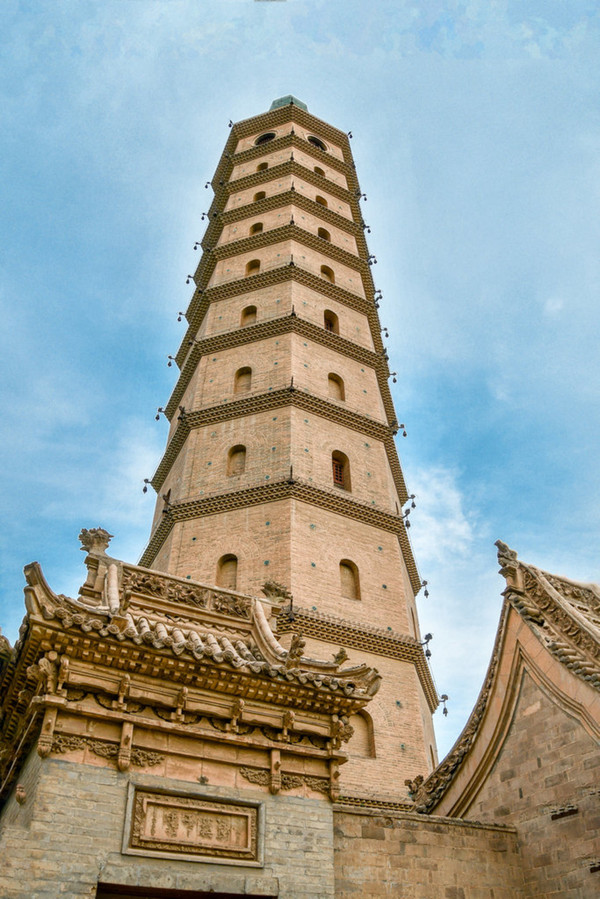 各层檐角石榴状的铁柄上挂有铁铃,微风吹过,丁当作响。