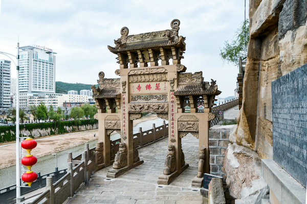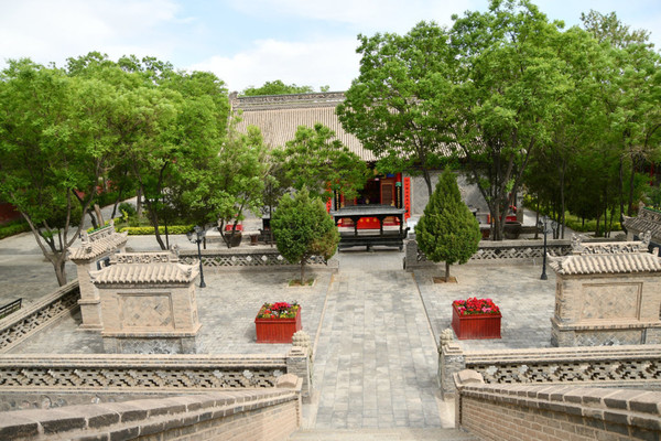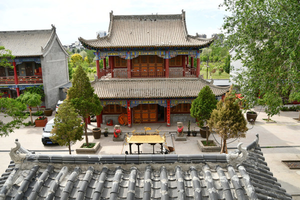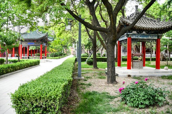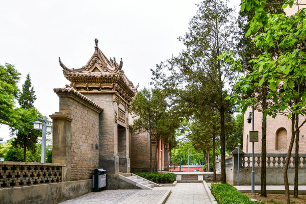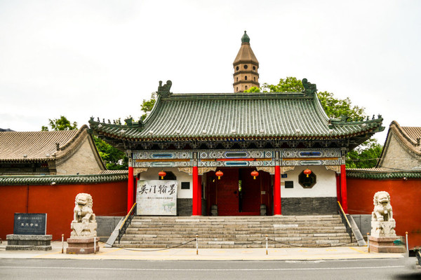 承天寺,寺门朝东开启,院内现存建筑有五佛殿、佛塔、韦驮殿、卧佛殿。韦驮、卧佛二殿两侧建有南北向配殿。殿宇之间,以重檐砖雕垂花门和围墙连接,形成四合院式的院中院。