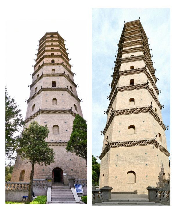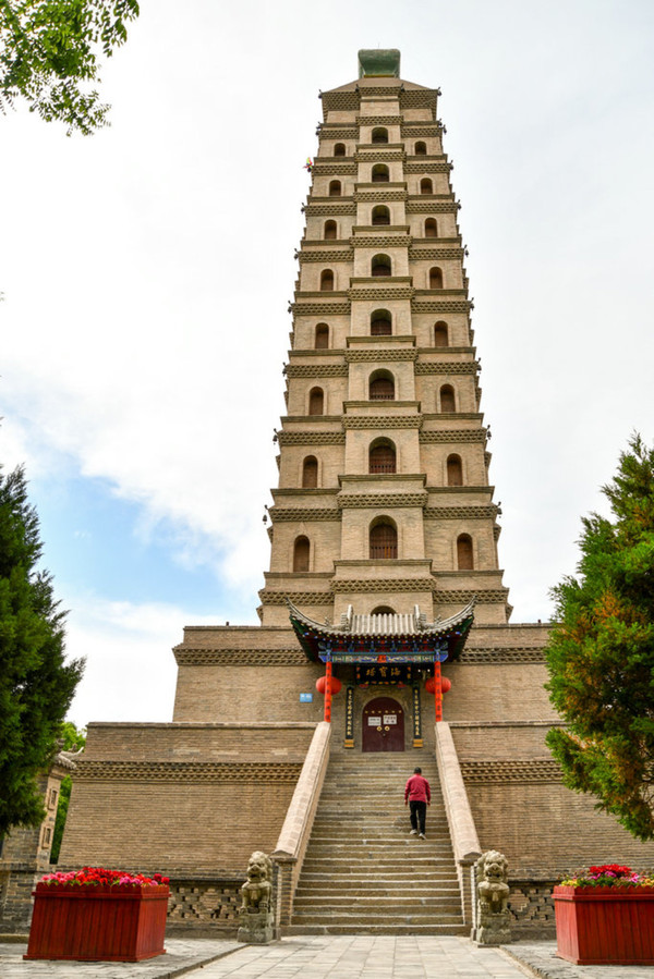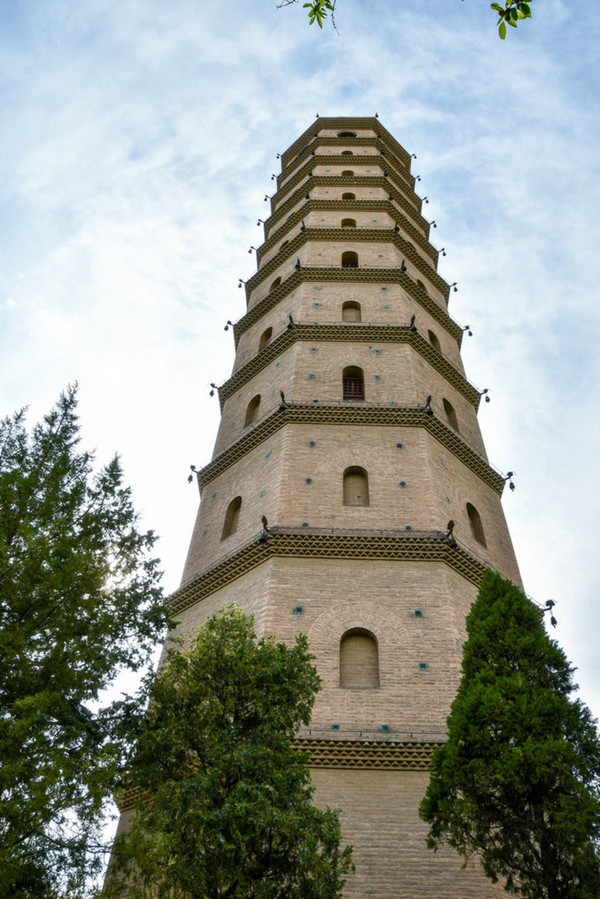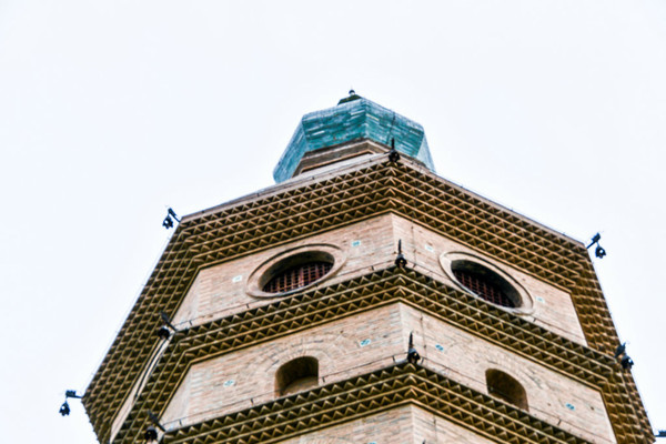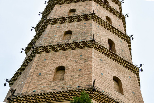 四、六、八、十层设东西向多门式明窗,十一层设四明四暗圆窗。整座塔造型挺拔,呈角锥形风格,古朴简洁。