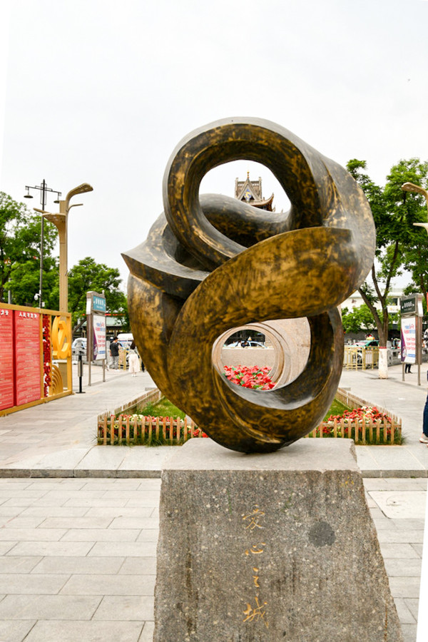 2013年,一个4岁的小女孩在步行街附近丢了自己人工耳蜗的体外处理器,这个耳蜗就是她的耳朵,如果找不到,孩子或许将永远告别有声世界。苦寻无果后,孩子父亲发了个帖子,让他没有想到的是,一场爱心接力就此开始。政务微博率先出手相助,公安、交通等部门积极互动,网友纷纷转发,传递着耳蜗的消息,报纸、电视、网站连续跟踪报道,公交公司更是将寻物启事贴上了公交车,出租车司机、环卫工人也加入到寻“耳”队伍中。在蝴蝶效应下,孩子父亲的电话被彻底打爆,114个小时后,耳蜗找到,4岁的孩子重新听到了声音。“爱心之城”雕塑,就是为纪念这个故事而修建的,在那惊心动魄的114个小时里,每个人都是英雄。