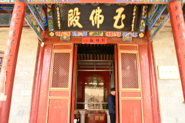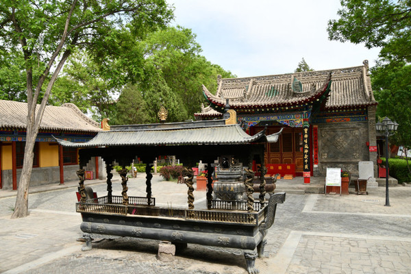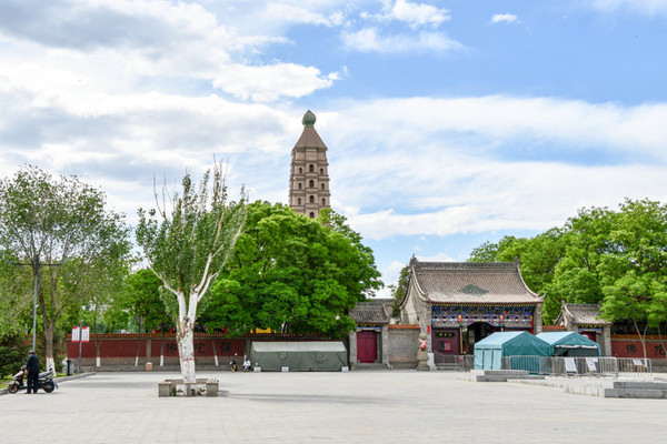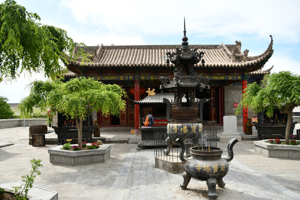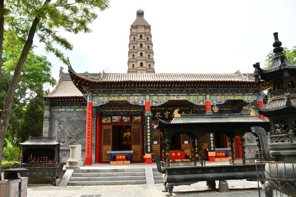 坐落在外院的五佛殿与佛塔同建在一条东西向的中轴线上。外院院落宽阔,古树参天,松柏长青,肃穆宁静。