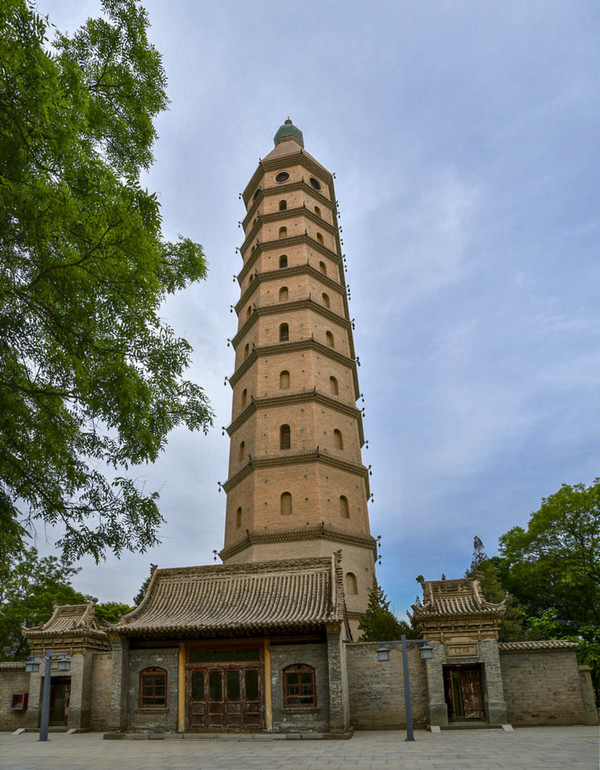 塔门面东,可通过4.8米的券道进入塔室。塔室呈方形空间,室内各层为木板楼层结构,有木梯盘旋而上。塔身一至二层各面设券门窗式壁龛,三、五、七、九层设南北券门式明窗,塔身各层收分较大,每层之间的塔檐上下各挑出三层棱牙砖。