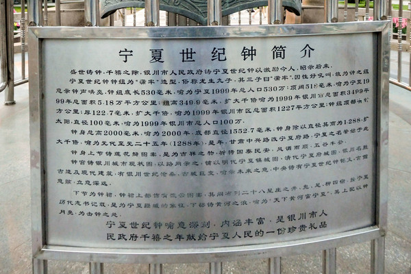 盛世铸钟,新千年到来之际,银川市委、市人民政府铸了宁夏世纪钟。这口钟蕴藏着丰厚的历史文化内涵,聚集着人们对未来美好生活的向往和追求。