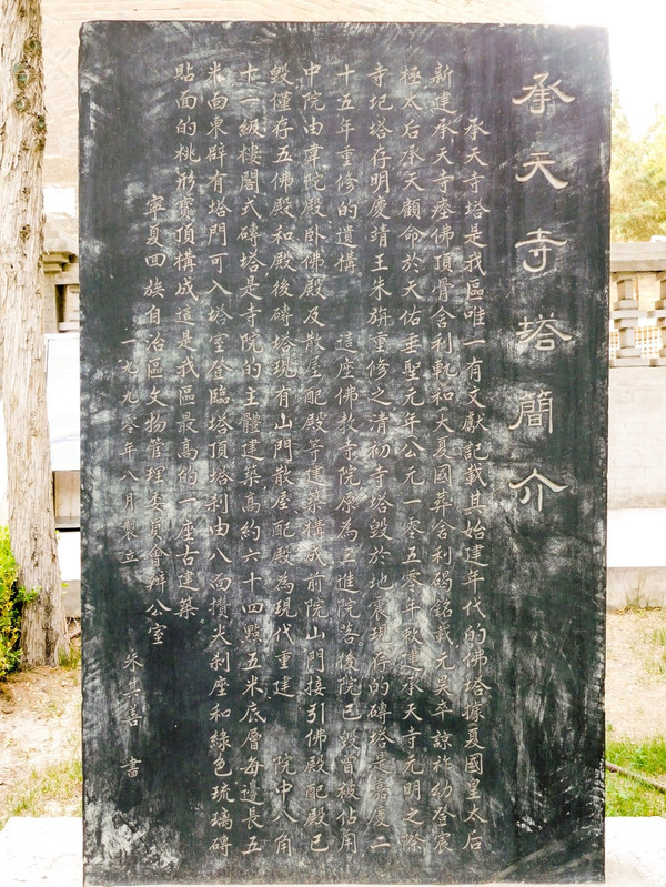承天寺塔是 宁夏 惟一有文献记载始建年代的古塔,也是 银川 一百多座古塔中最高的,这座敕建的佛塔和佛寺,工程浩大,役兵数万,历时五六年。建塔时,皇太后还用金棺银椁将西域僧人进献的佛顶骨舍利密装后,埋于塔基之下。