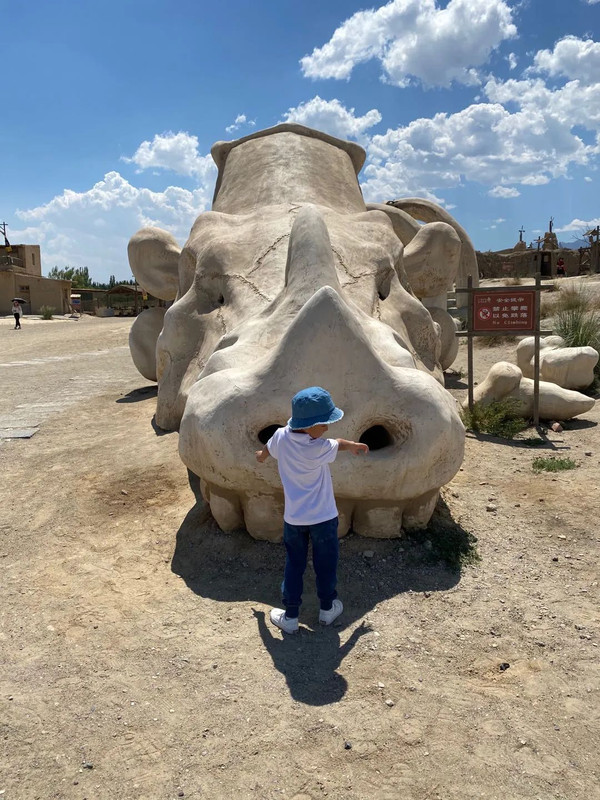 祺小宝已意趣阑珊,祺爸只好拿怪兽吸引他,明城外的神犀残骸造型,鼻子像猪,头顶有角,身材庞大!据说是按民间关于乾隆年间宁夏大地震的传说搞的雕塑,传说那场地震造成镇北堡地裂,裂缝里出现了巨犀骨架,有传说这是水神共工的坐骑神犀,又传说有位镇北堡的军医判断此乃龙骨,可以入药,然后被瓜分一空,毛都不剩!这个雕塑放在这里,是为了地震祈福的,人都有良好的愿望!