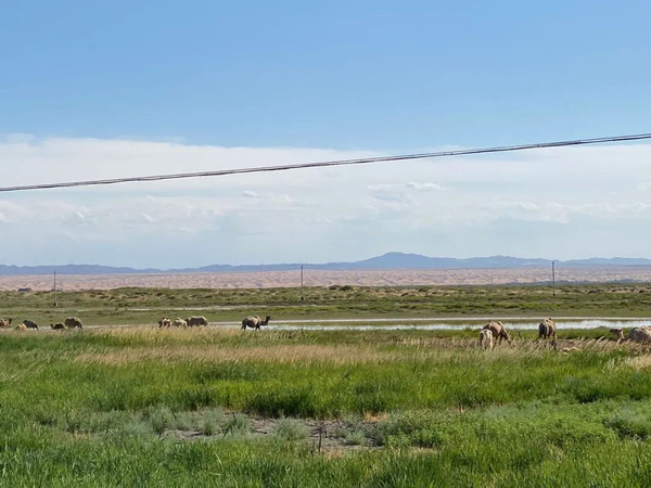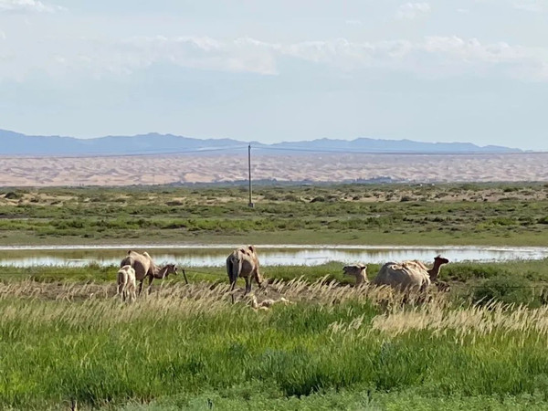 218省道路边,一群骆驼在这里放牧,第一次看见成群放牧的骆驼