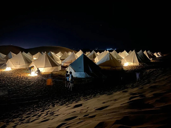 太阳坠入长夜,顺便带走了光明,阳光谢幕,沙漠营地便成了灯的主场,在无尽的黑夜中,被灯火炫染了的帐篷,看起来就像晶莹剔透的水晶,沙漠的夜,美得不可方言。