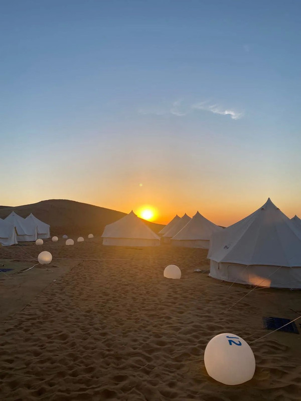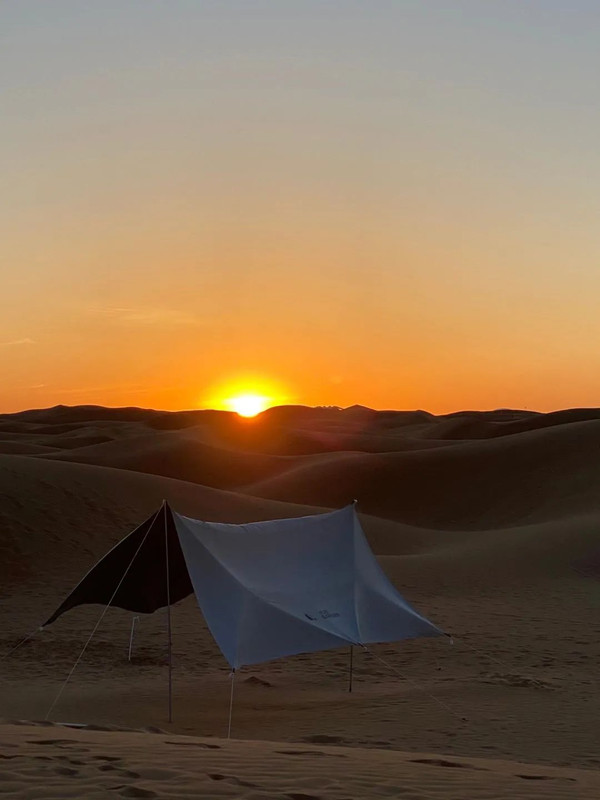 迷迷瞪瞪似睡似未睡,四点来钟,感觉天已大亮,帐篷并不遮光,外面也好像热闹了起来,感觉营地尚未完全入睡,却又被阳光唤醒,祺爸打开帐篷门,太阳已爬上了营地东边的沙丘,迫不及待地将还没有熟透了的光线撒向大漠。