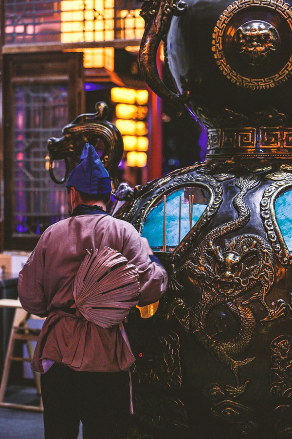 看够了老镇和演出,就去柘林老镇美食一条街,各地地道美食,也真的花样百出;我竟然看到一家用“太上老君炼丹炉来烤串”,老板的打扮是济公。