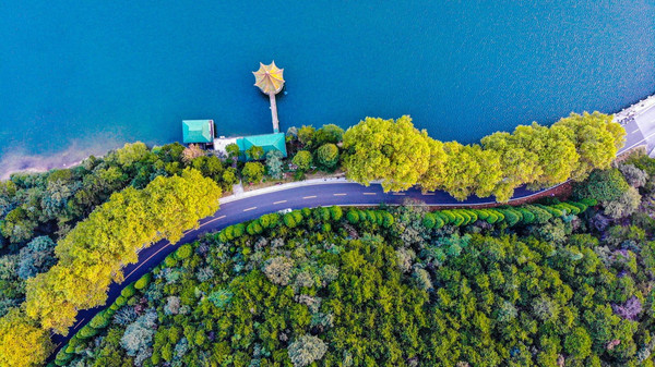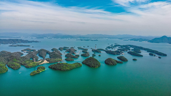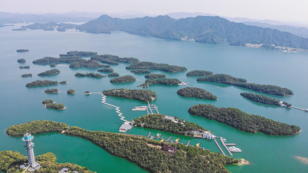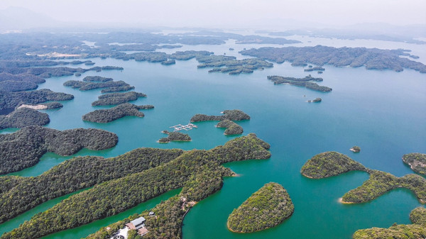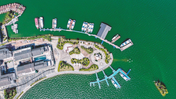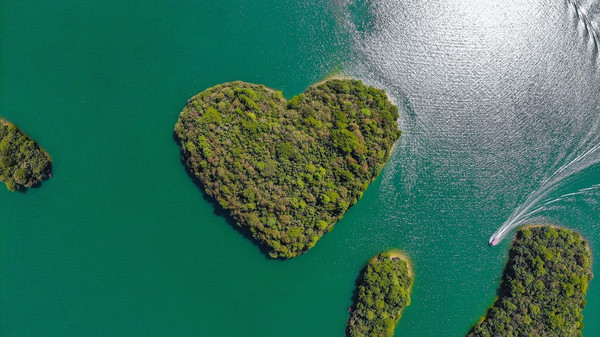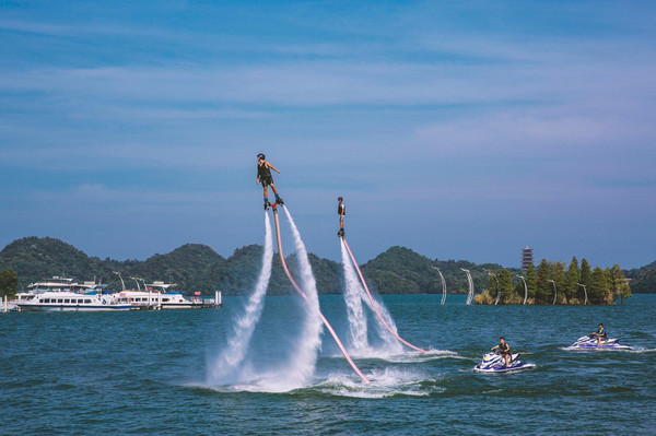 在广阔无垠的湖面上,绿岛拥翠、碧波万顷,水上飞机动感滑翔,爱心岛浪漫温情。