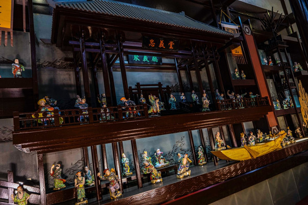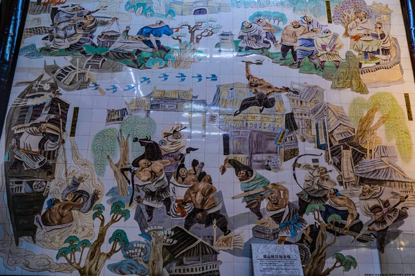 底楼大厅内陈放着梁山108位将领的瓷身人像,栩栩如生,姿态各异,两侧墙壁上镶嵌的大型瓷板画,描绘的正是当年宋江在浔阳楼上题《西江月》“反诗”的彩色石膏塑像,墙壁上有今人书写的宋江“反诗”