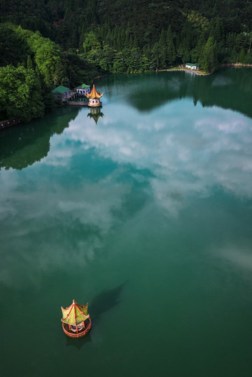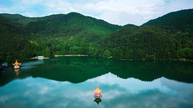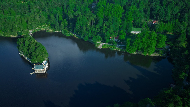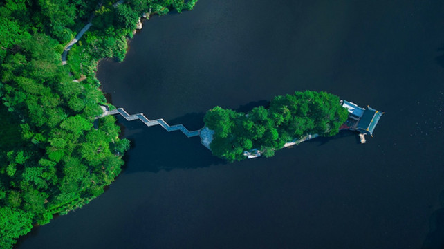 如琴湖,因湖形如琴而得名,湖中有曲桥、亭榭。航拍视角下,湖岸曲线玲珑,湖面似一把小提琴,山树层层,环湖漫步,赏心悦目。