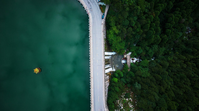 通过航拍视角,能看到整个芦林大桥,其高30米,桥坝一体,拦水成湖,似发光的署玉镶嵌在林萌秀谷之中,美得令人心醉。