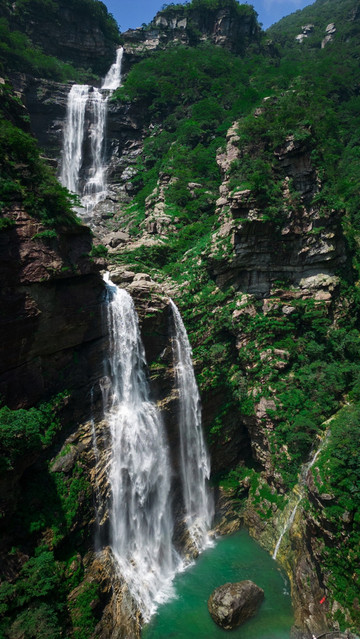 瀑布溪水分三叠,上级如飘雪拖练,中级如碎玉摧冰,下级如玉龙走潭。找到瀑布前的一块岩石,像李白一般饮酒作诗,瀑布的水雾飞溅而来,如梦如幻。