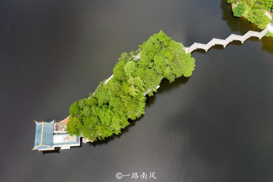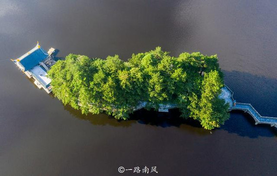 如琴湖的湖心小岛叫孔雀岛,岛内有很多人工饲养的孔雀,由于正在维护,并没有进去,相信景色一定非常漂亮,我从高空抓拍,并在不同角度观赏,发现颜值都很高,是如琴湖最重要的景观之一。