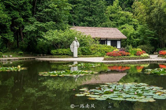 白居易草堂后来被开发成陈列室,堂前的左侧建有白居易立像,据说是1996年由著名雕塑家王克庆制作的。
